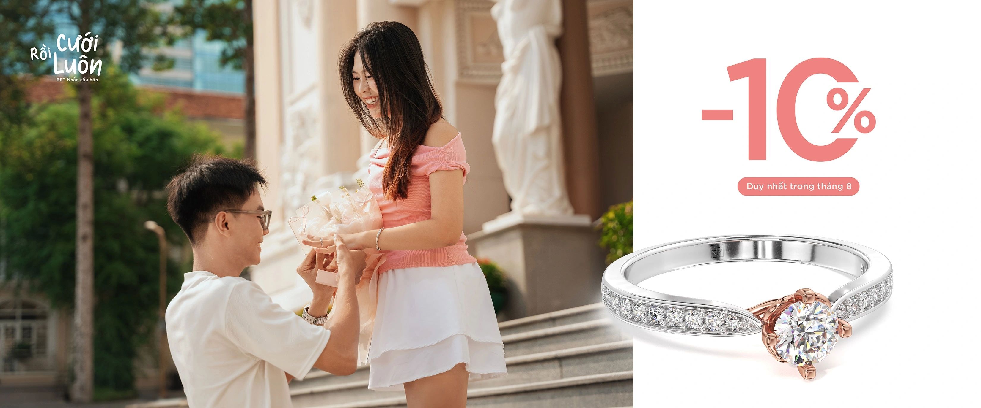 Duy nhất trong tháng 8 này, Huy Thanh tặng bạn deal xịn nhất năm -10% toàn bộ nhẫn cầu hôn (Áp dụng bao gồm cả kim cương viên và Moissanite viên đính kèm nhẫn cầu hôn)