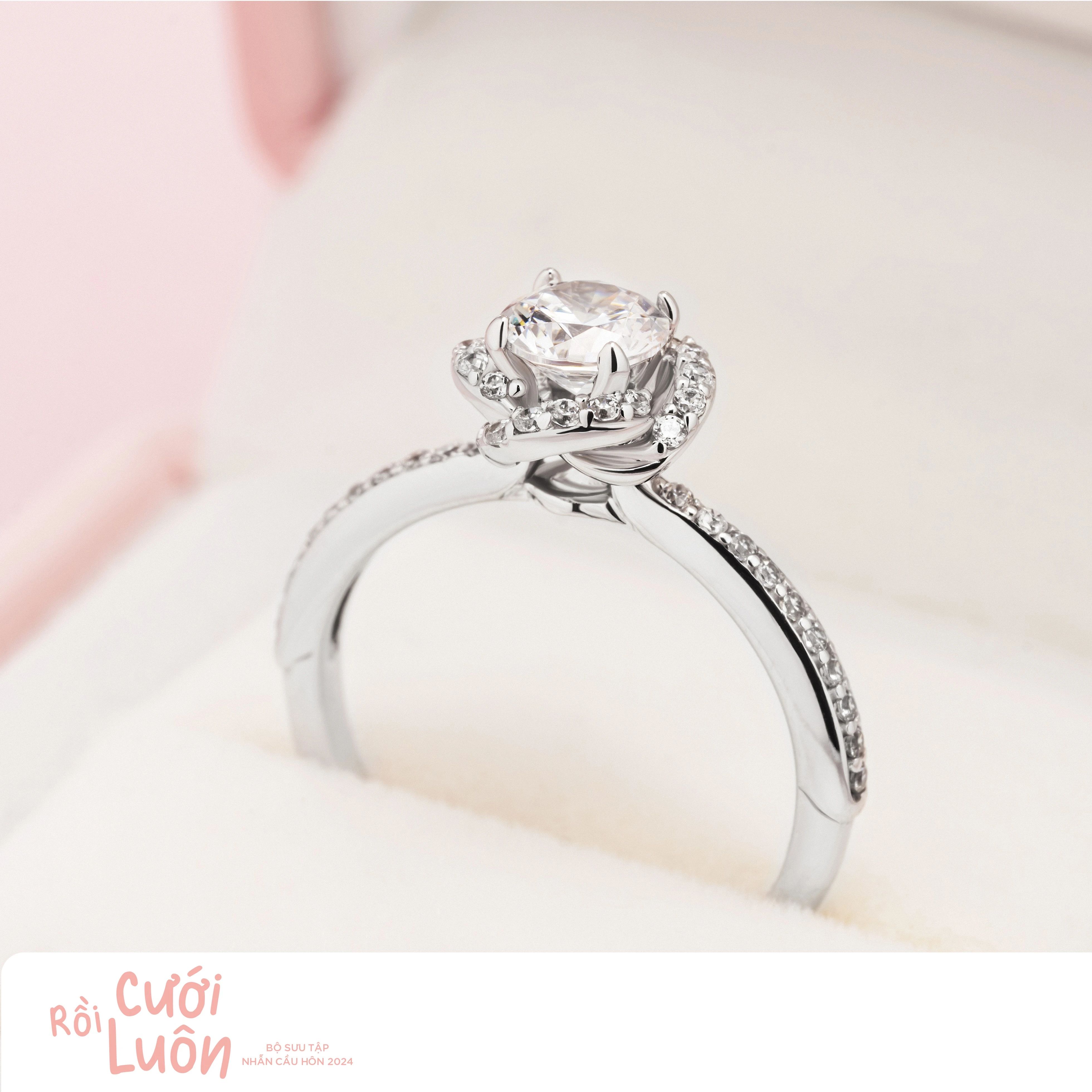 Thiết kế của chiếc nhẫn được lấy cảm hứng từ hình ảnh hoa hồng - loài hoa biểu tượng của tình yêu vĩnh hằng. Dáng nhẫn Halo với ổ đá cao, đính toàn bộ đá CZ cao cấp dọc phần đai nhẫn đem đến vẻ lấp lánh và lung linh từ mọi góc độ cho chiếc nhẫn này.