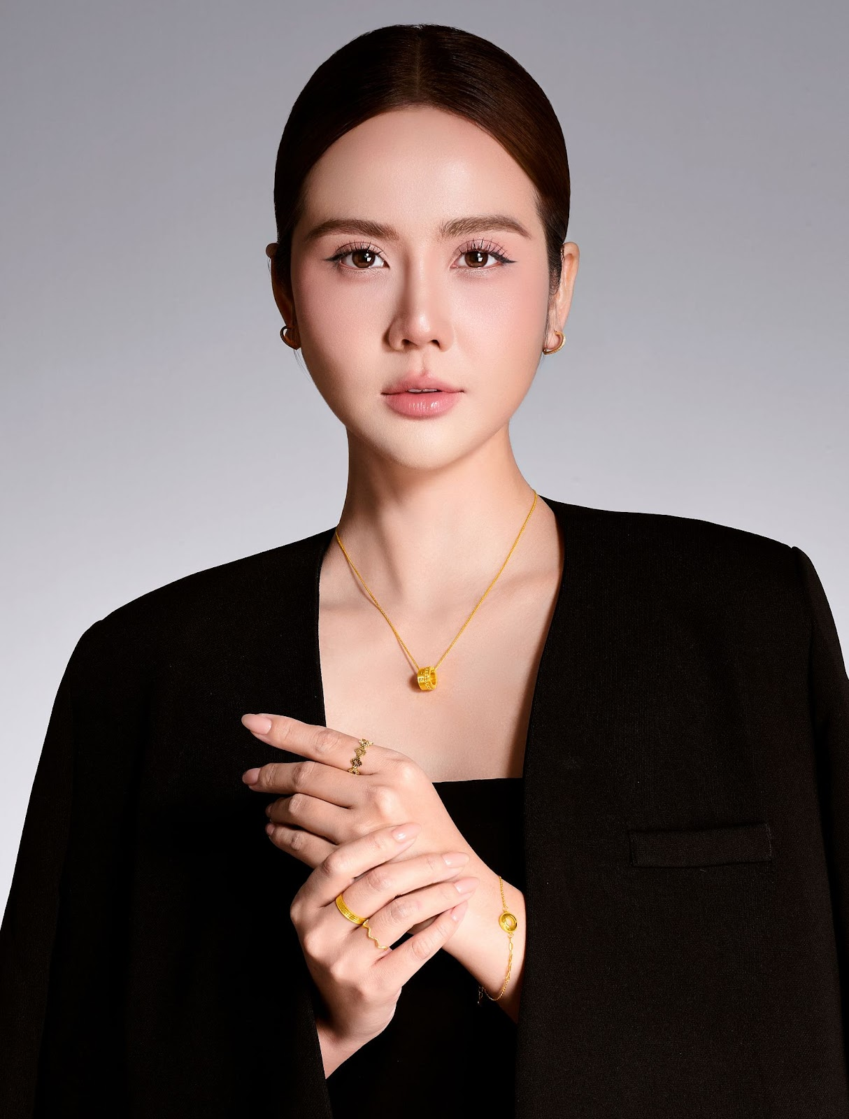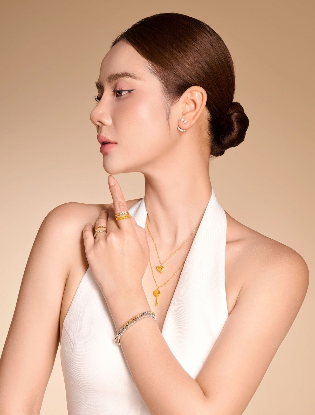 Diễn viên Huyền Lizzie diện trang sức vàng 24K kết hợp cùng phong cách hiện đại, cá tính nhưng cũng đầy quyền lực, hoàn thiện vẻ đẹp thời thượng và đẳng cấp.