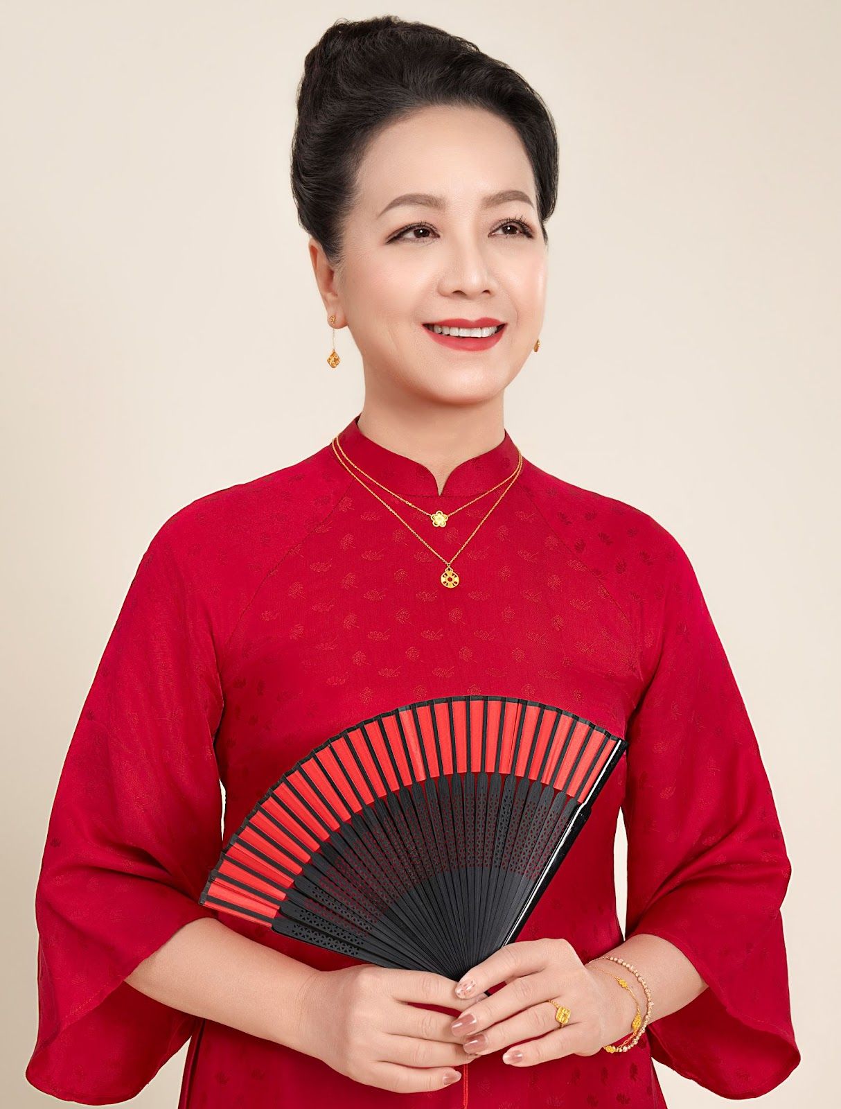 Nghệ sĩ ưu tú Chiều Xuân lựa chọn tà áo dài truyền thống kết hợp cùng trang sức vàng 24K, mang đến vẻ đẹp dịu dàng, thanh tú đậm chất Á Đông. Trang sức vàng 24K giúp tôn lên nét quý phái và sang trọng, đặc biệt hoàn hảo để diện vào dịp Tết Nguyên Đán.